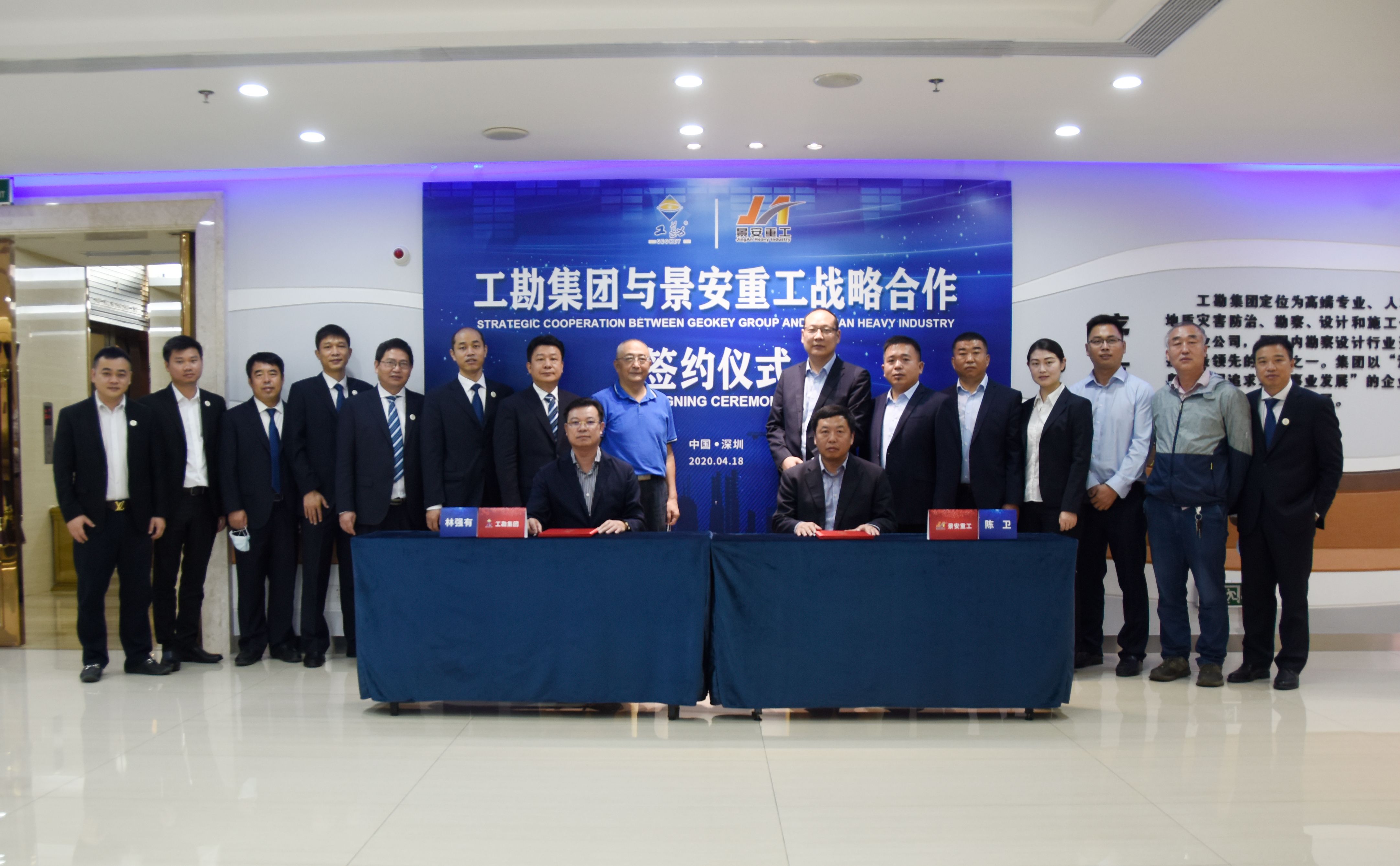 2020年4月18日上午,工勘集團(tuán)與徐州景安重工機(jī)械制造有限公司(以下簡(jiǎn)稱景安重工)戰(zhàn)略合作框架協(xié)議簽約儀式在工勘集團(tuán)總部舉行。景安重工董事長(zhǎng)陳衛(wèi)、總經(jīng)理魏垂勇、副總經(jīng)理李景峰,工勘集團(tuán)董事長(zhǎng)林強(qiáng)有,工勘巖土集團(tuán)副董事長(zhǎng)雷斌、總經(jīng)理李紅波、總工程師王賢能、副總經(jīng)理付文光、李新元等雙方領(lǐng)導(dǎo)及相關(guān)部門負(fù)責(zé)人出席了簽約儀式,深圳市土木建筑學(xué)會(huì)巖土工程專業(yè)委員會(huì)主任劉小敏等嘉賓受邀見證了簽約。