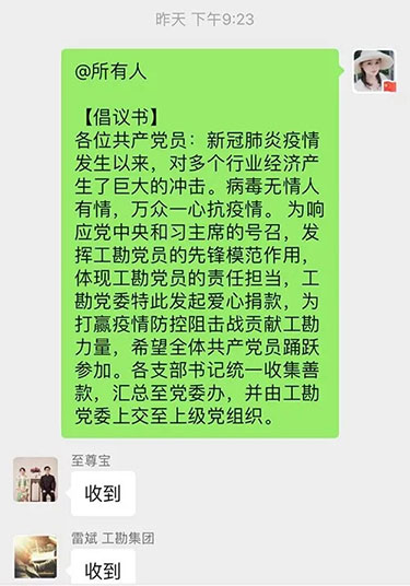為響應黨中央號召,2020年2月26日晚,工勘集團黨委迅速行動,向黨員發(fā)出“抗擊疫情擔使命,凝心聚力黨旗紅”的倡議,鼓勵黨員自覺自愿捐款,為支援新冠肺炎疫情防控工作貢獻工勘力量。